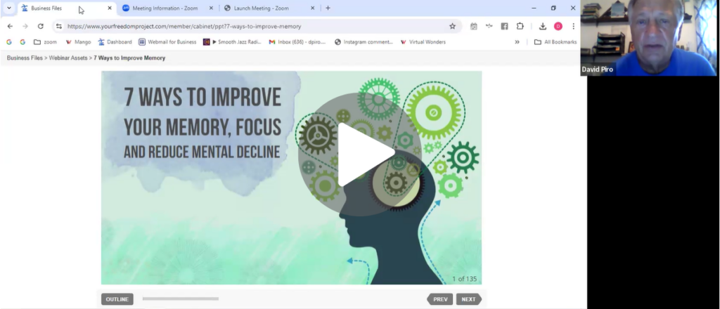Without further ado, I dusted off a few slides from a presentation not too long ago. I reviewed it, and the information is still current. So I will share this with you now. Today’s title and topic will be 7 Ways to Improve Your Memory, Focus, and Reduce Mental Decline.